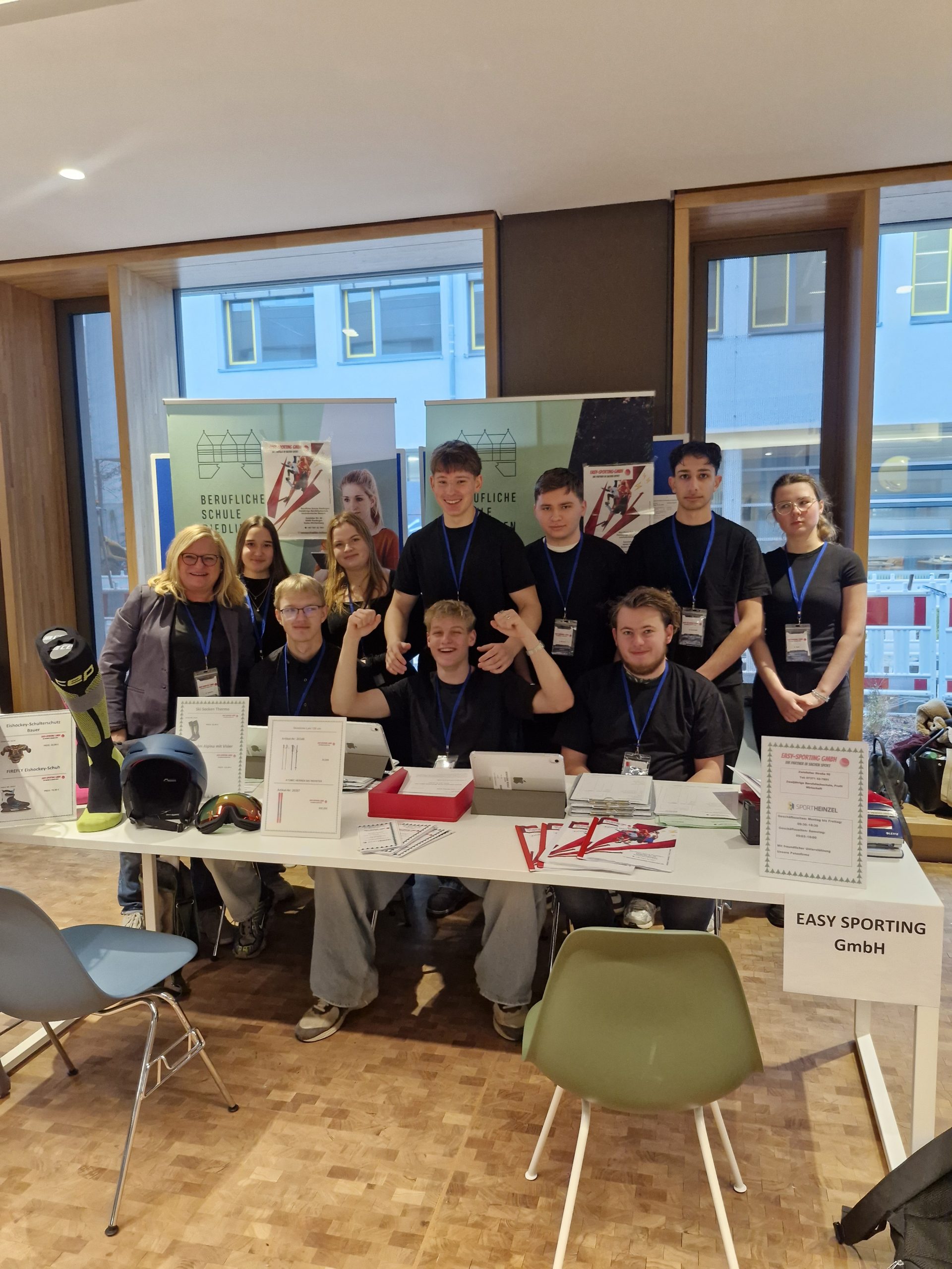 Doris Hagel, die Lehrerin der Übungsfirma, war schon früh morgens mit den Messeartikeln auf dem Weg nach Ulm, um dort den Stand der Easy Sporting GmbH aufzubauen. Mit der Unterstützung von Sport Heinzel GmbH & Co.KG in Biberach, die als Patenfirma fungiert, gelingt es immer wieder, ein breites Spektrum an Sportbekleidung zu präsentieren. Die Schüler*innen der 2BFW2 kamen mit Frau Lemke mit dem Zug von Riedlingen nach Ulm. Dort angekommen, wurde die Messe von Schulleiter Markus Pfeil mit einer Rede eröffnet. Alle Schüler*innen arbeiteten in Schichten am Messestand und tätigten Verkäufe sowie Verkaufsgespräche über unsere Sportartikel. Zusätzlich mussten sie in vier anderen Übungsfirmen einkaufen. Dieser direkte Kontakt mit anderen Übungsfirmen ist es auch, was die Jugendlichen immer wieder erfreut und so war auch diese Messe für die Klasse ein Erfolg und es gab ein positives Feedback.